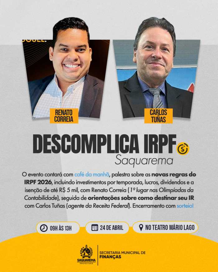 A Prefeitura de Saquarema, por meio da Secretaria Municipal de Finanças, em parceria com o Conselho Regional de Contabilidade do Estado do Rio de Janeiro – CRC/RJ, promoverá o evento "Descomplica IRPF Saquarema", com o objetivo de orientar a população sobre a declaração do Imposto de Renda Pessoa Física (IRPF) 2026.
